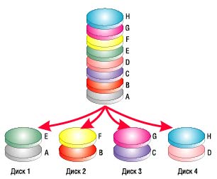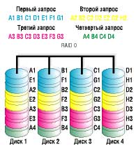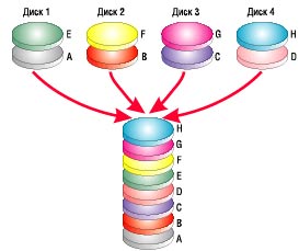 ...причем запись нескольких блоков на различные диски происходит одновременно, что и приводит к увеличению производительности в операциях записи. Нужная информация также считывается отдельными блоками одновременно с нескольких дисков, что также способствует росту производительности пропорционально количеству дисков в массиве.