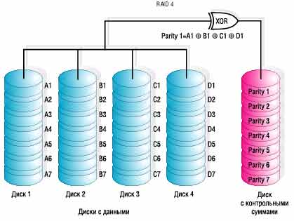 RAID 4 повышает производительность передачи файлов малого объема (за счет распараллеливания операции считывания). Но поскольку при записи должна вычисляться контрольная сумма на выделенном диске, одновременное выполнение операций здесь невозможно (налицо асимметричность операций ввода и вывода). Рассматриваемый уровень не обеспечивает преимущества в скорости при передаче данных большого объема. Эта схема хранения разрабатывалась для приложений, в которых данные изначально разбиты на небольшие блоки, поэтому нет необходимости дополнительно их разбивать. RAID 4 представляет собой неплохое решение для файл-серверов, информация с которых преимущественно считывается и редко записывается. Эта схема хранения данных имеет невысокую стоимость, но ее реализация достаточно сложна, как и восстановление данных при сбое.